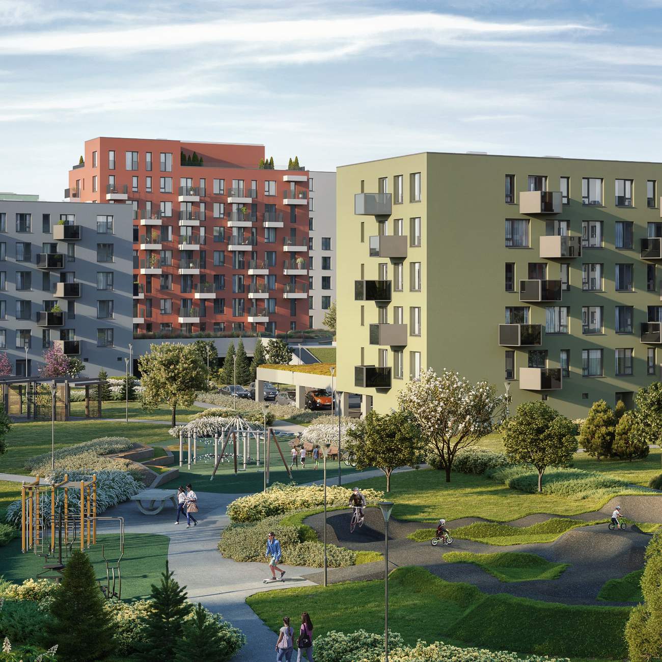 Расположенный в районе тщательно спланированный парк площадью около 7000 квадратных метров предложит занятия для каждого. Здесь вы найдете игровые площадки, фруктовые деревья и площадку для пикников, где так приятно расслабиться после работы на траве или в уютной беседке. В парке также появятся тренажерный зал на открытом воздухе и уникальная трасса для трюков на BMX и самокатах для тех, кто интересуется экстремальными видами спорта. В собственном домашнем парке дети могут играть со своими друзь