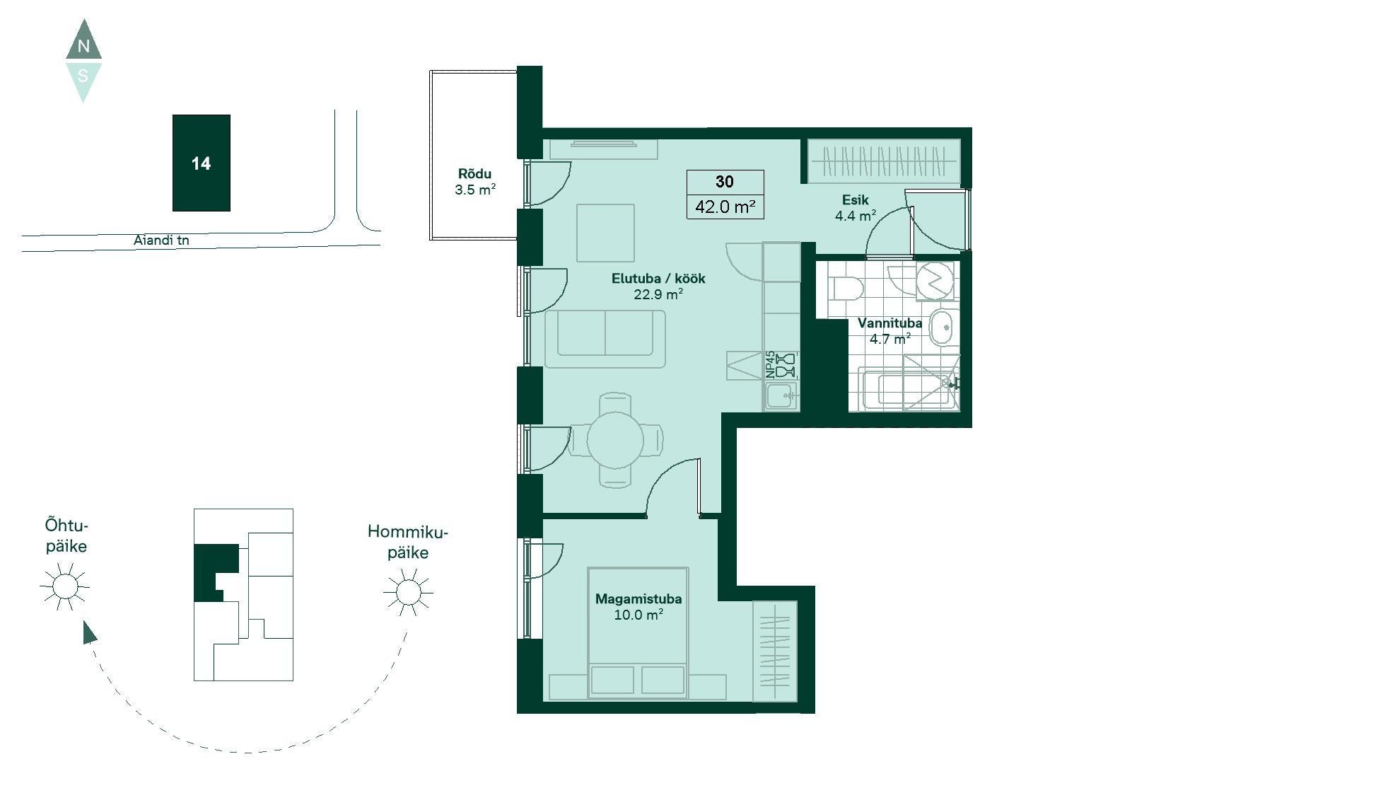 Aiandi 14-30, 2 комнаты, 42 м²